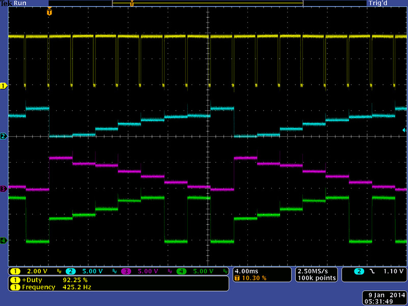 The maximum frequency of the 960 Sequential Controller is just a bit over 400 Hz. The clock is a positive 90% duty cycle and increases slightly at the maximum frequency. This image shows the three outputs.