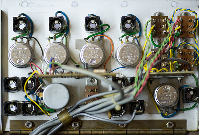 Console Panel 3 has switches for routing four controller CV signals, a four input mixer, a click filter, and four jacks that could be used as multiples or trunk routing. The switches are rear illuminated to indicate which controllers are patched in. The mixer provides non-inverted and inverted outputs with a master gain control. I restored another CP3 that wasn't in a cabinet so have some additional photos here.