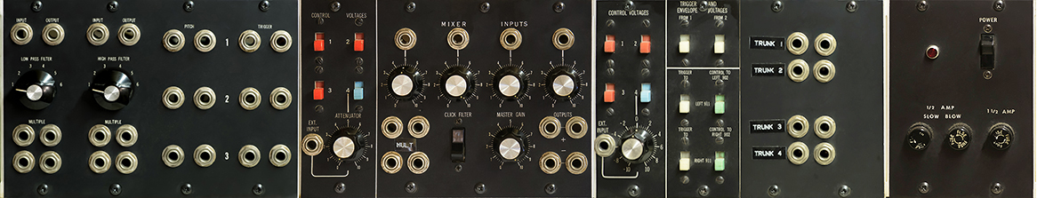 The Console Panels consist of a model 2 panel with passive filters and pitch and trigger jacks, three model 3 panels with CV routing and a four input mixer, a modified model 4A panel with CV and Trigger routing and trunk multiples, and a model 8 power panel.