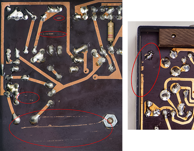 I was surprised to see etch problems on two PCBs although these modules are quite early for PCB production. The missing run on the right was jumpered on top with holes drilled through the PCB so they took some care in the repairs.