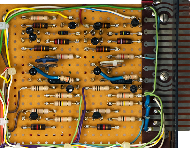 I strived to keep the repairs as original as possible. I used period-correct resistors and ended up hand selecting quite a few for the oscillators and envelope generators to meet specifications. There were a number of modifications made over the years that I removed and restored to original functionality. There were some electrical problems but quite a few electro-mechanical problems. Switches and jacks no longer made contact, trimmers were intermittent and wires were broken. Some resistors had drifted, some capacitors were leaky, and a few transistors were dead, but for 45+ years old the modules were in respectable condition.