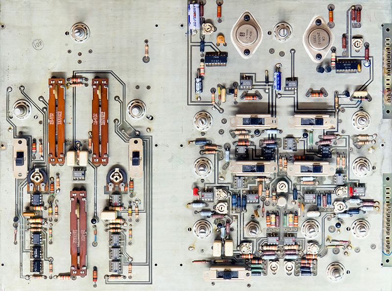 The rear of PCB2 is masked and the potentiometers extend through. The amplifier module is also mounted on the rear.