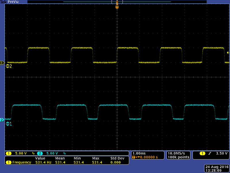 The Incremental Controller was reported to only count up when warm although I could not reproduce it.  The output from the Incremental Controller had good levels but Φ1 caught my attention.  The rising edge of  Φ1 is too soon after the falling edge of Φ2.  At increased speeds these transitions nearly overlap.  I have some experience with optical encoders since I designed the optical thumbwheels for the Tektronix 4100 series of graphic terminals.  The encoder should be counting a gray code with a 50% duty cycle and a 90° phase shift between outputs.