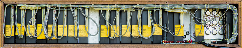 The bottom cabinet contains the trunk and controller bus wiring, power supply, and 22 MU module space with 14 modules and 6 console panels.