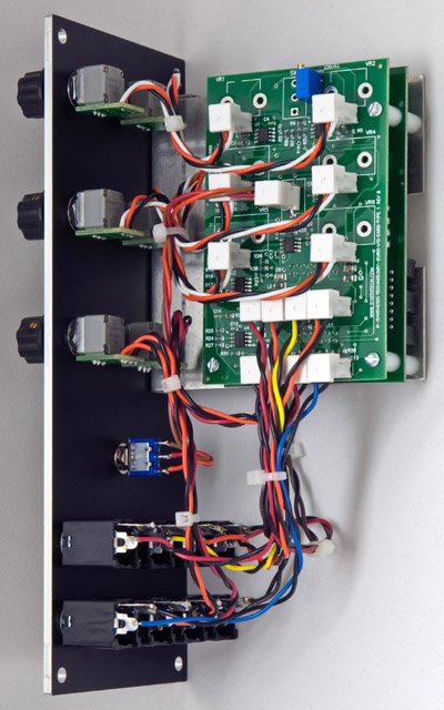 There are a lot of front panel wires on this module. Using a separate 3 pin MTA connector for each control, jack, and switch simplifies the wiring task.
