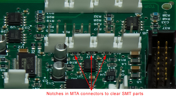 I notched 4 of the MTA connectors to clear some of the SMT parts. I went ahead and installed the top row left MTA even though it is not used. There is insufficient room next to JP2 for an MTA connector so I used a FCI connector instead for the delay control.