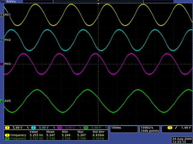 These scope images show the three phase sine waves from the main LFO and the sine or triangle wave from the aux LFO. The diode waveshaping produces a reasonable sine wave.