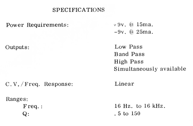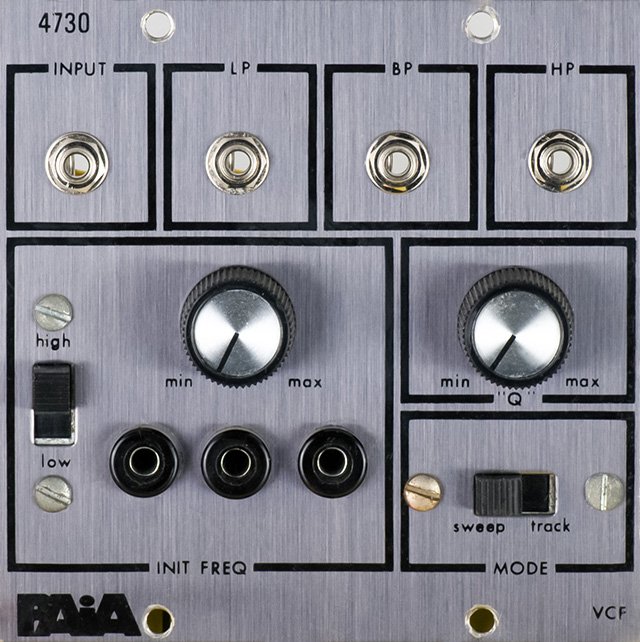 The 4730 is a second order state variable filter with low pass, band pass, and high pass outputs. The filter has a high / low range, resonance, and a sweep/track mode. The filter should be set to track when the filter is being controlled by a keyboard (e.g. tracking a VCO), and set to sweep when the CV will go to 0V (e.g. a LFO as the CV). This kit was $37.95 in the 1976 catalog.