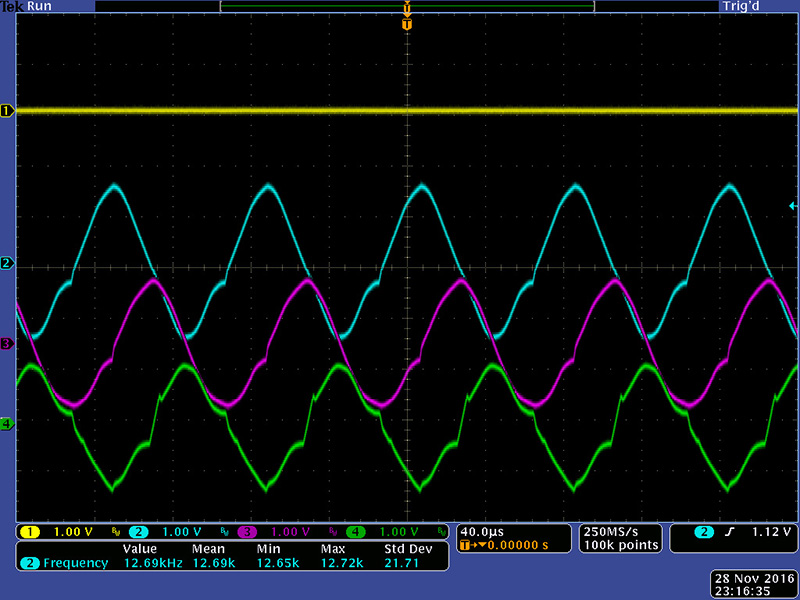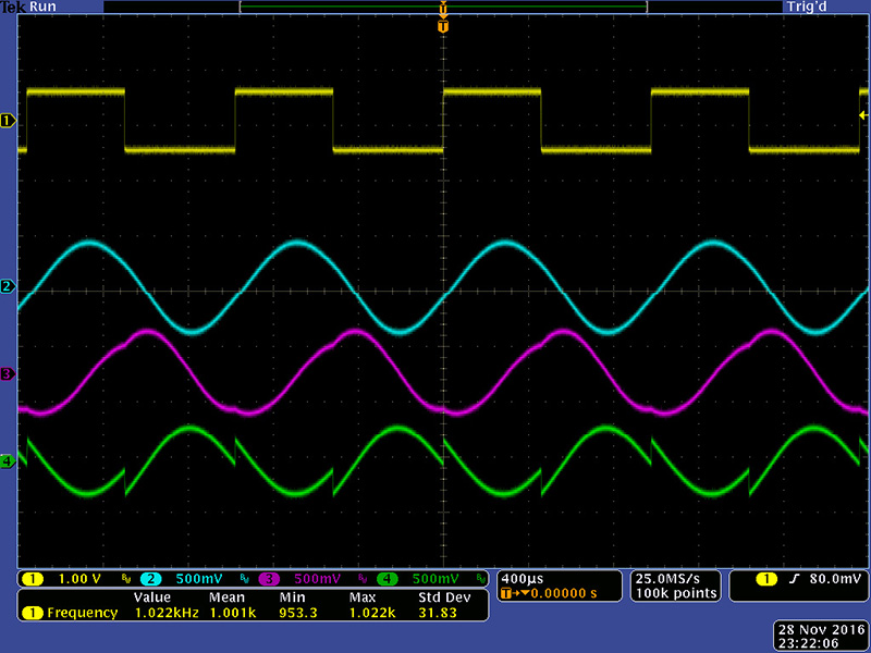This scope image shows a frequency setting where all three outputs are near-sine shape.