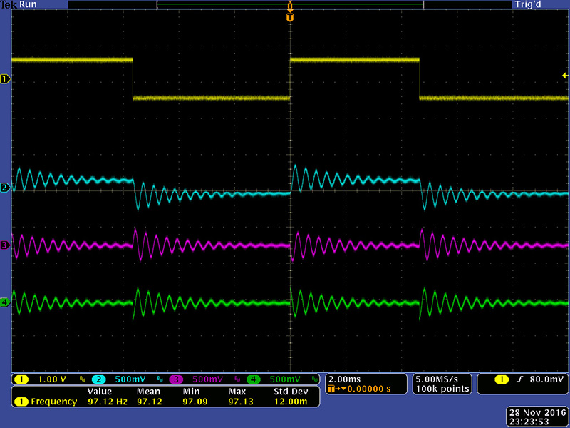 An external CV must be applied in order to set the initial frequency. Calibration is straight forward but requires a number of passes. This scope image shows the filter self-oscillating. It would only self-oscillate with a 5V CV and at maximum control settings. The waveforms are Input, LP, BP, and HP.