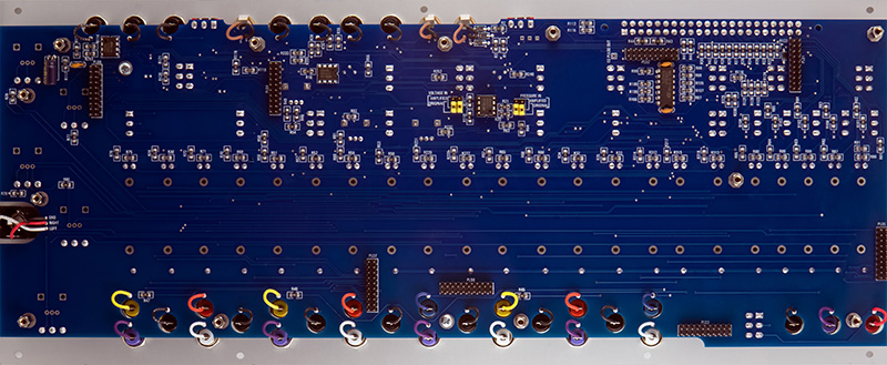 The banana, three 3.5 mm jacks, and the 1/4" jacks are now wired to the PCB. I used 1" lengths of colored wire to match the color of the banana jacks. All the correct standoffs are in place for mating PCB2.