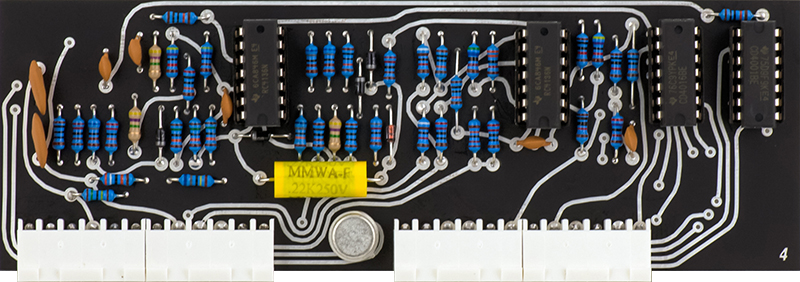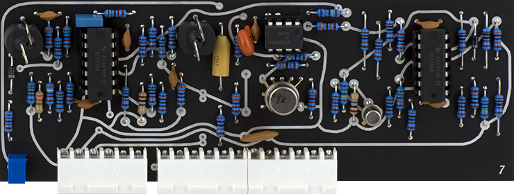 To diminish bleed of the EG into the audio cut the run to the edge pin 5 on Card3 and solder a 1K resistor across the cut. Also add 0.1µF decoupling capacitors on the power supply pins on IC1, IC4, IC5, and IC6.