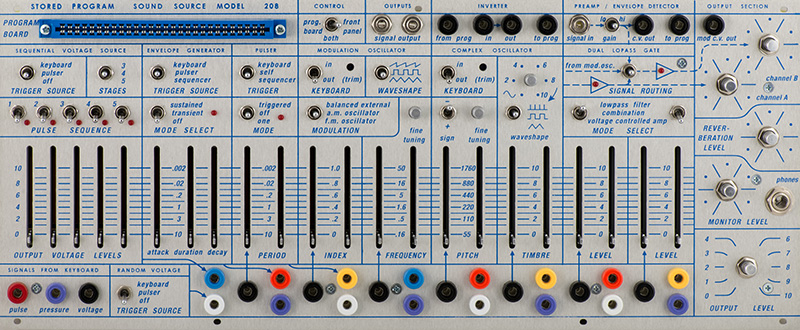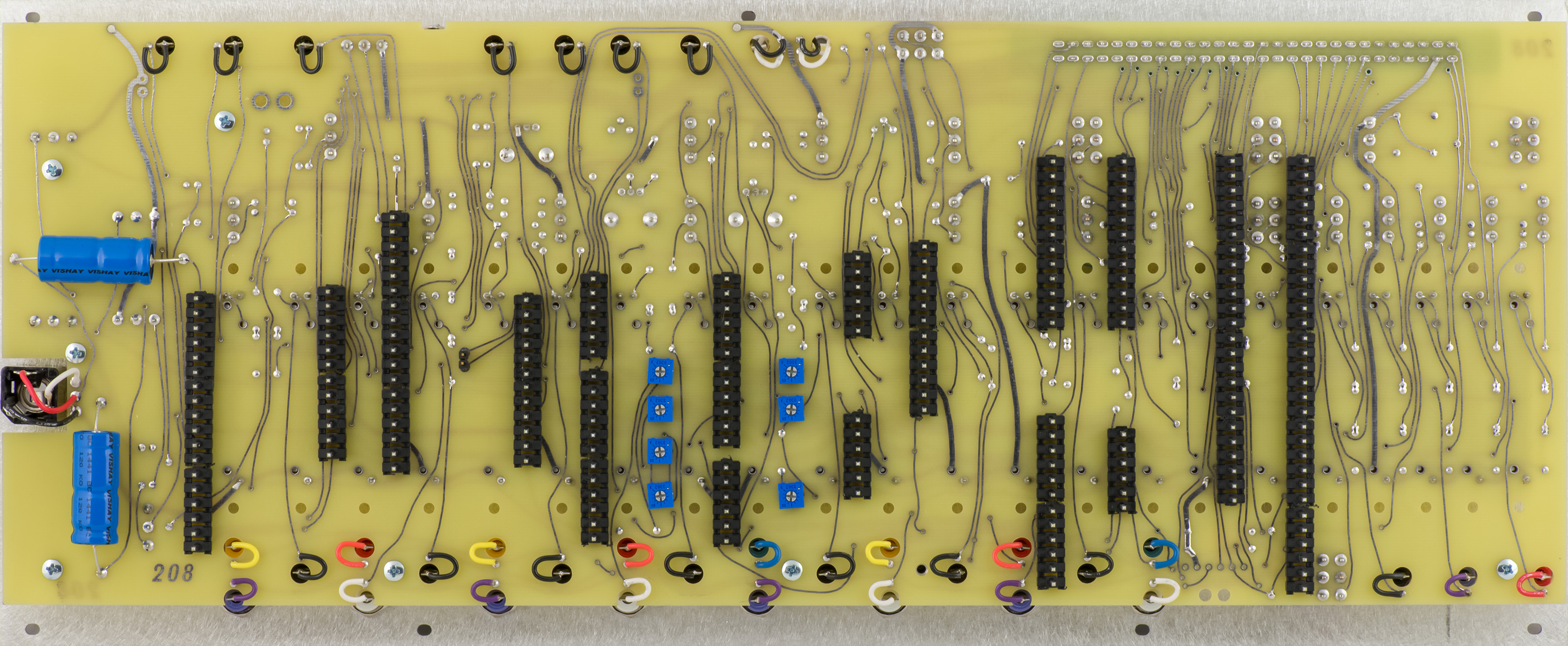 I built a V2 208 Stored Program Sound Source module for someone else. They sent me a mostly complete kit of parts (excluding knobs, slider caps and a few miscellaneous components) and I assembled and tested the module. Many of the components are sourced through Mouser but specialized parts, panel, and knobs have specific sourcing requirements. V2 is designed as per the original module with a motherboard and 12 plug-in cards. The individual cards makes the PCBs easier to assemble but it takes much longer to build them. This module took me 27.5 hours to build.