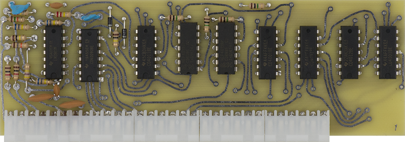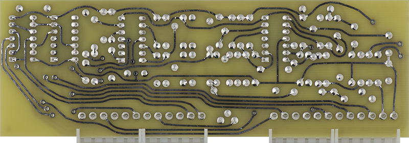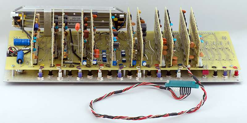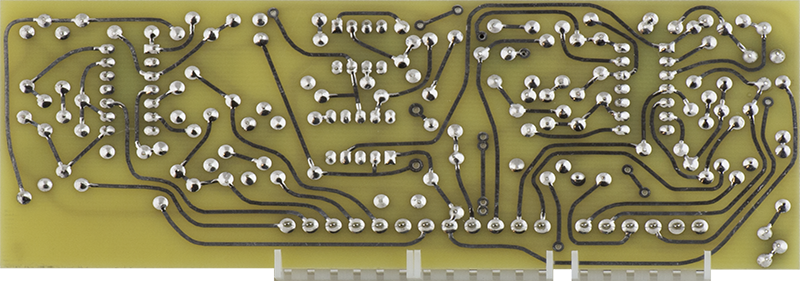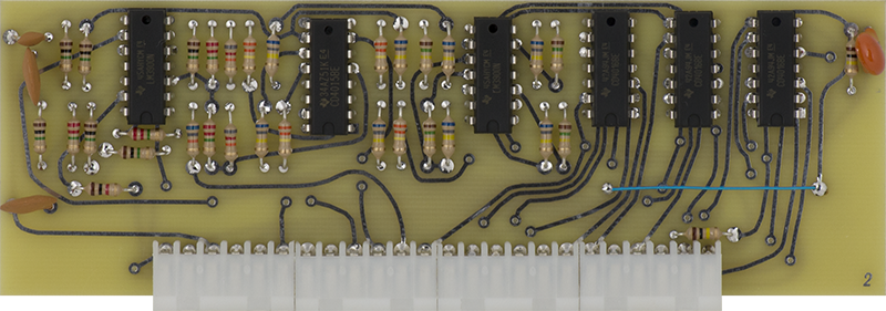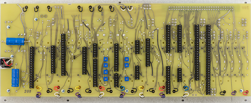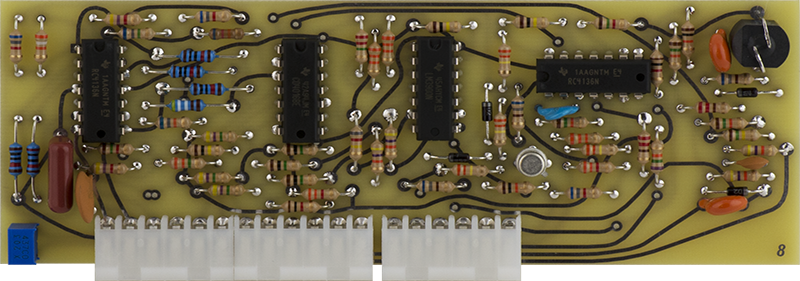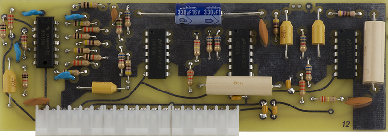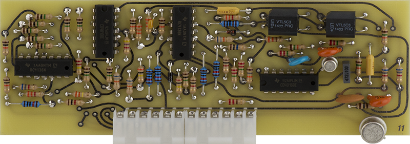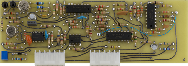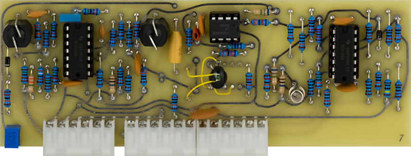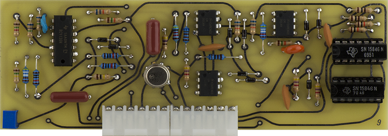 This early version CO is rather complex consisting of two COs on Cards 7, 8, and 9. Card 7 consists of the CV circuitry, Card 8 consists of the second CO and the Card 9 CO waveshaping circuitry, and Card 9 consists of the main CO. Timbre is created by using the Card 8 CO to FM modulate the Card 9 CO.