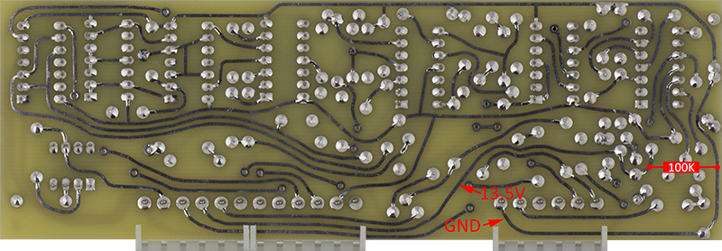 The regulator requires a load and the original schematics had a 100K from edge pin 4 to ground. I added the resistor on the rear.