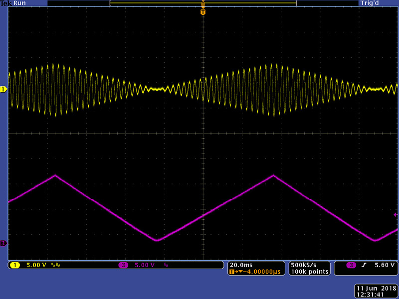 I recently repaired a 208 where the MO was not functional. I was monitoring the MO in the signal output and once I got it working the output was very weak. Looking at it on an oscilloscope the output was highly differentiated. The MO is mixed to the signal output through C4 on Card 11. This is a 1 µF capacitor feeding a 10K potentiometer which is a high pass filter with a lower frequency cutoff of 15 Hz. I increased C4 to 47 µF with a capacitor on the rear of the card where there is more room. This allows lower frequency MO output to be passed through on the signal outputs. This scope image shows the mixing of a low frequency MO triangle with a high frequency CO which is not possible with the original 1µF capacitor.