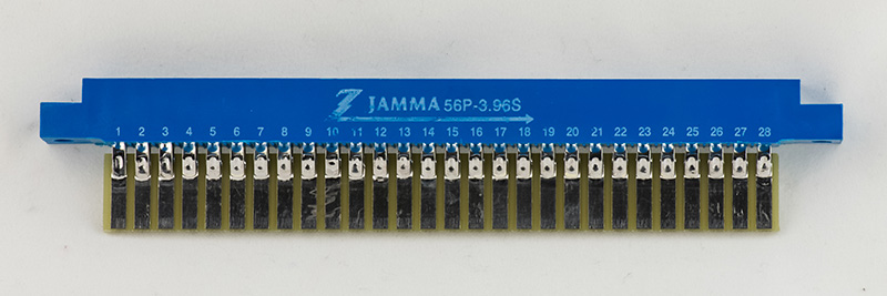 This image shows the motherboard front with the potentiometers soldered by only one pin and the LEDs unsoldered. It took 5 hours and 45 minutes to solder the motherboard. I used water washable flux solder and no-clean solder for the potentiometers, switches, and LEDs although I do clean them anyway. I used a more robust EDAC edge connector (Mouser 587-305-056-500-202) for the motherboard and used the blue Jamma 56P-3.96S connector for the front panel.