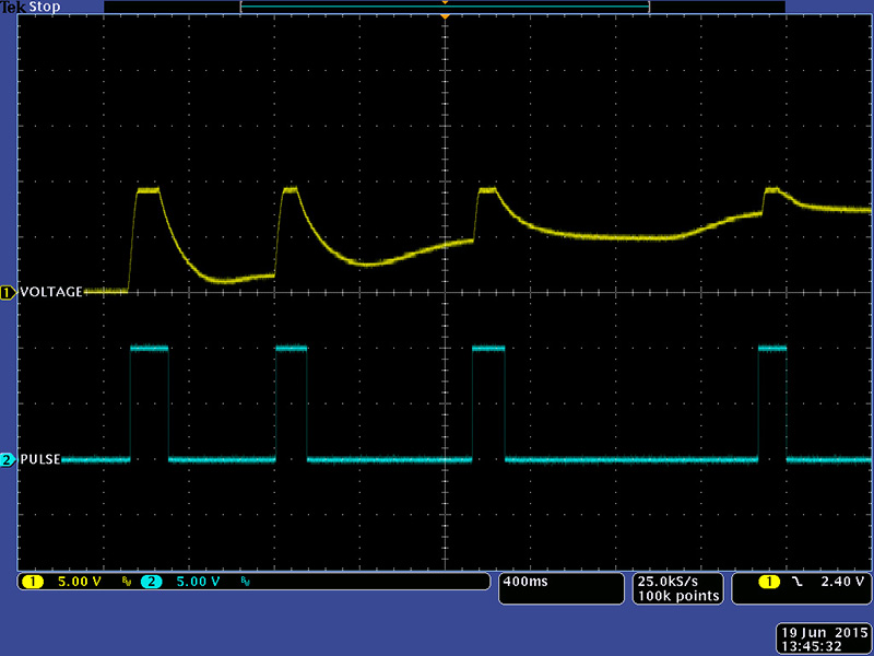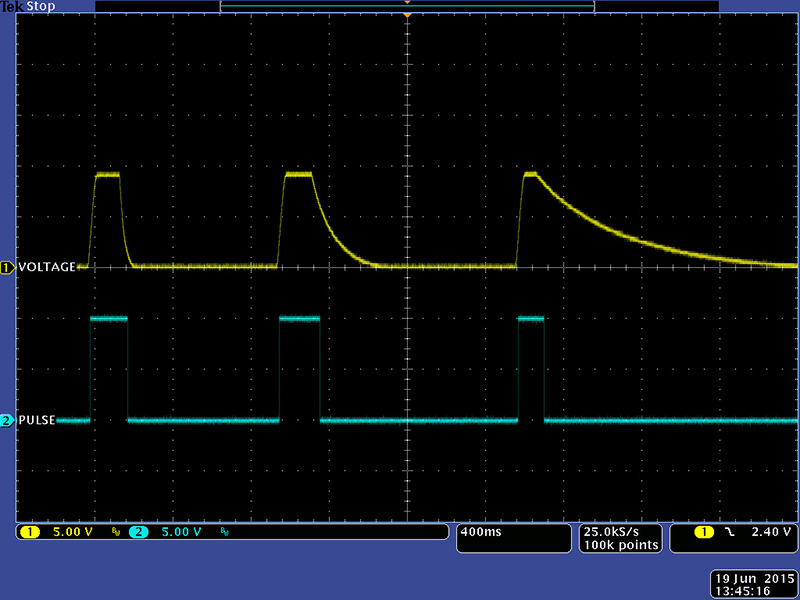 The 216 is comprised of two separate sections. The first three touch sensors provide a voltage output with a variable baseline and decay time and a pulse (gate) output. This scope image shows three different decay times.