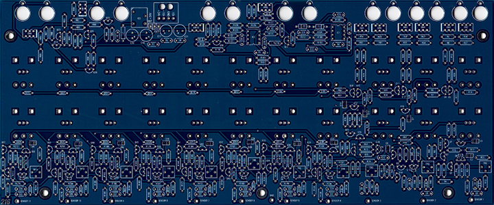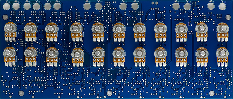 The front panel consists of 22 potentiometers and the touch panels. These potentiometers have only one pin soldered. I mount the panel then reflow the pin so the potentiometer relaxes without stress, then solder the other two pins. There was a bit of a bow in this PCB so the potentiometers in the middle sit a bit further off the PCB.