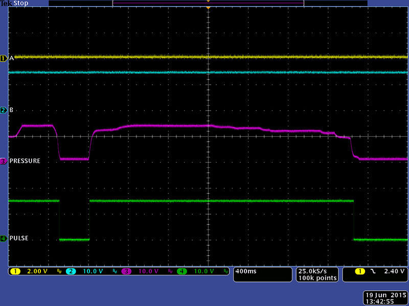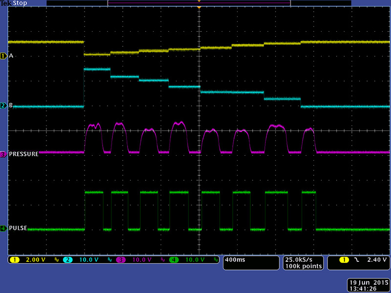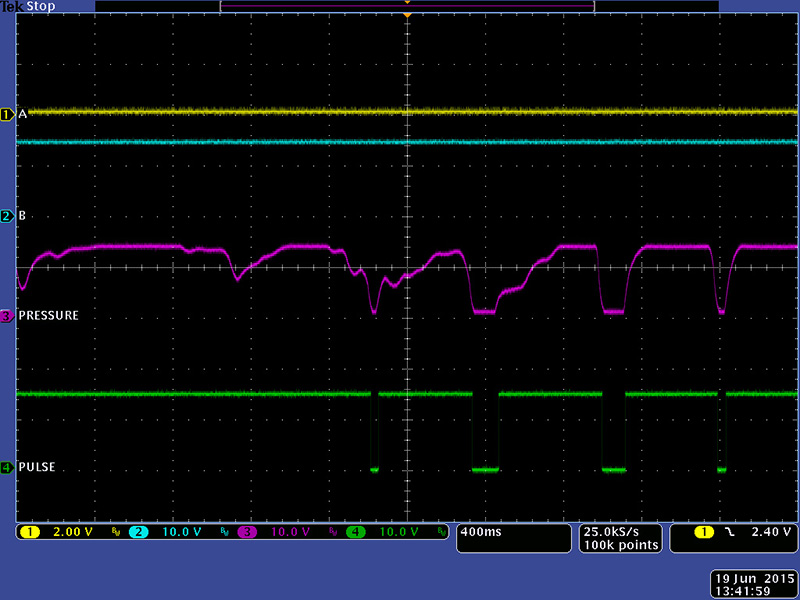 When you release a sensor the pressure and pulse pulse outputs go false so it is easy to get multiple triggers with very light pressure as shown in this scope image.