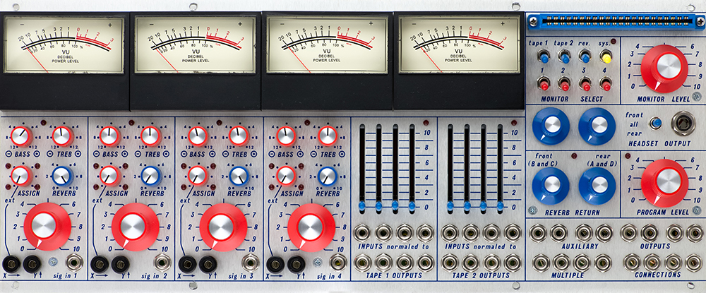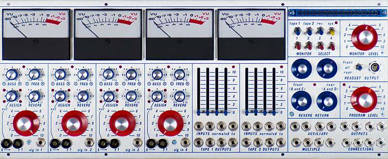 There are four independent mono input sections each with a separate level, bass, treble, reverb send and assign control. Assign pans the channel to program A, B, C, or D. Program A and D are the rear channels and B and C are the front channels. There are two CV inputs, X and Y, which will pan the signal from front to rear (A>B) or left to right (A>D).