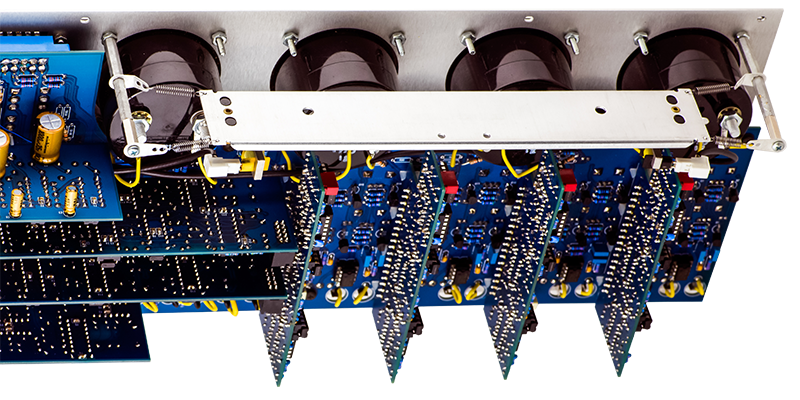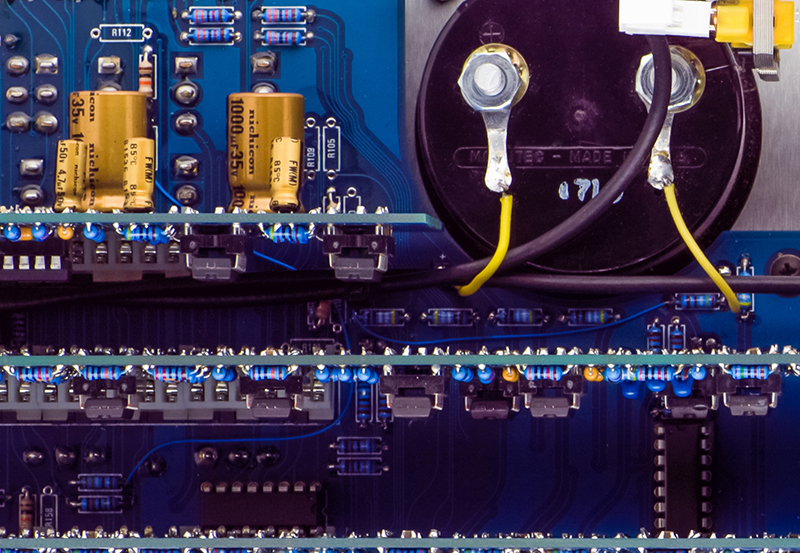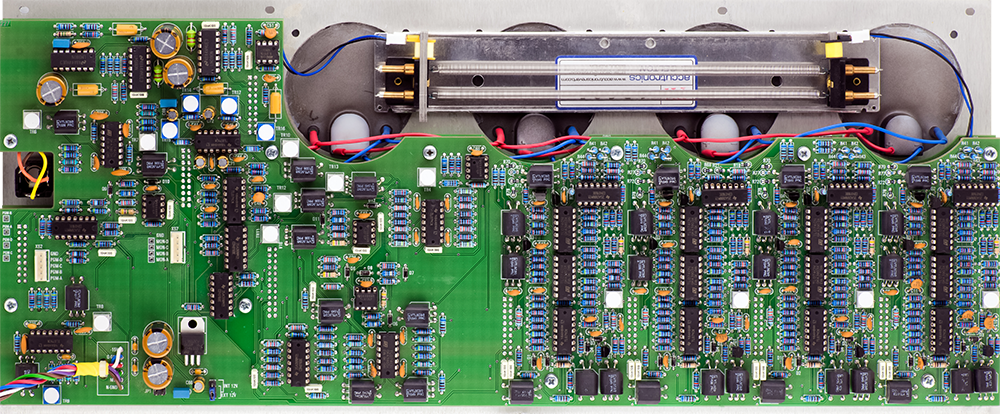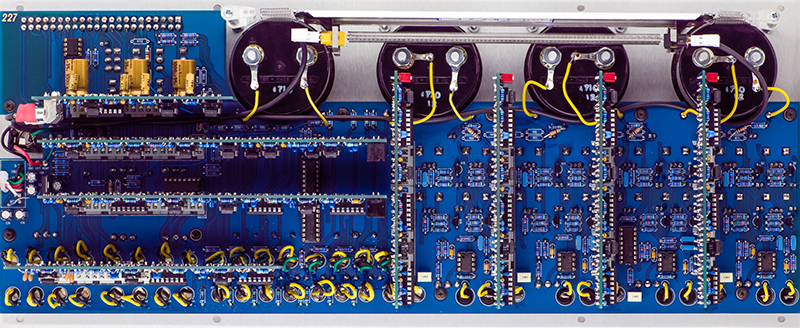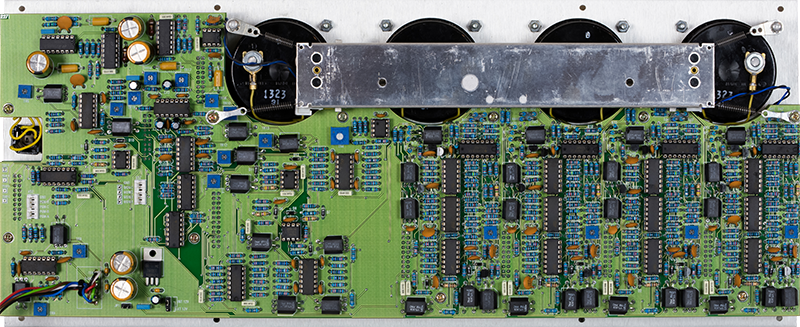 The tape section is comprised of Tape Output jacks which are directly connected to the expansion card Tape Input jacks and normalled to the panel Tape Inputs jacks just above them. Inserting a plug into the panel Tape Input jacks on the panel breaks the connection to the Tape Output jacks and the expansion card Tape Input jacks which are still connected. The sliders attenuate the Tape Input signal.