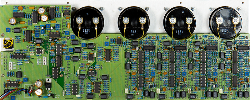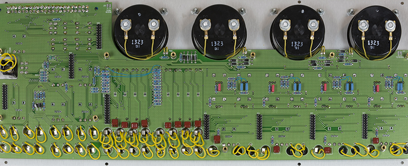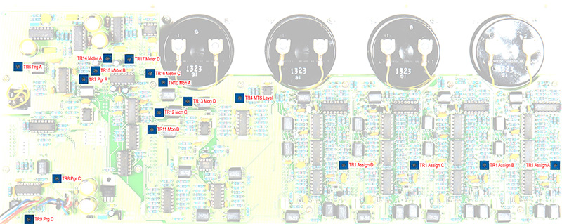 There are 17 trimmers on this PCB consisting of a single MTS level trimmer and four groups of four trimmers: assign, meters, program bus signals, and monitor bus signals.