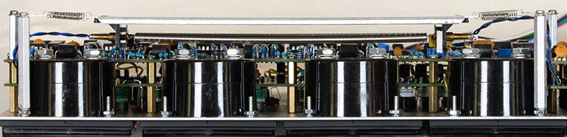 I mounted the reverb tank parallel to PCB2 using four standoffs, two on the outer meter studs and two on the nearby PCB screws. The meter standoffs are 2" 4-40 aluminum standoffs (Mouser 534-2207) and the PCB standoffs are 25mm M3 aluminum standoffs (Mouser 534-24448). I made some M3 studs and glued them into the standoffs to make them male-female. I used short and long solder lugs on the standoffs for the spring attachment points.