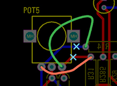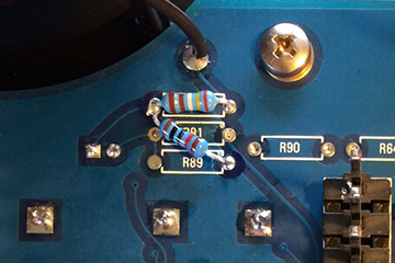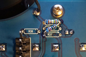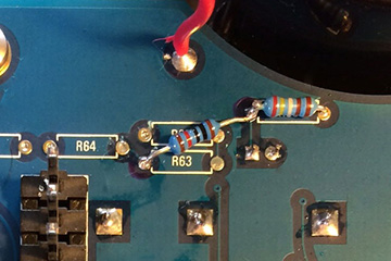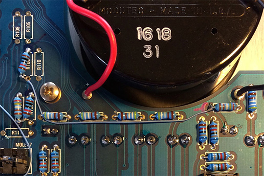 The LED and bass control modifications require ten cuts to runs. Eight cuts are on the front of PCB1 and two are on the rear. I decided to add all the mod wires to the rear so they would be more easily accessible. This image shows the two LED mod wires.