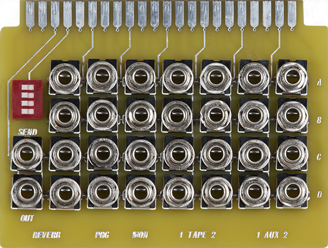 The right top corner has a 44 pin connector that mates with an expansion card. The expansion card has output jacks for program A-D and monitor A-D. There are input jacks Tape 1 A-D and Tape 2 A-D which connect to the Tape Output jacks and are normalled to the Tape Input jacks. The Aux 1 A-D and Aux 2 A-D jacks connect to the Auxiliary Output jacks on the panel. There are jacks for reverb Send, reverb Out (from tank), and Reverb return A-D. The four DIP switches connect the reverb Out to the Reverb return A-D so need to be in the right position to enable reverb.
