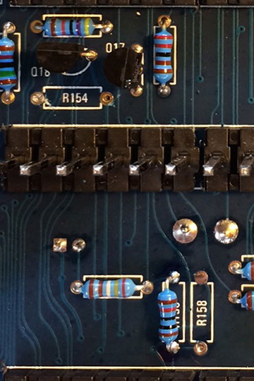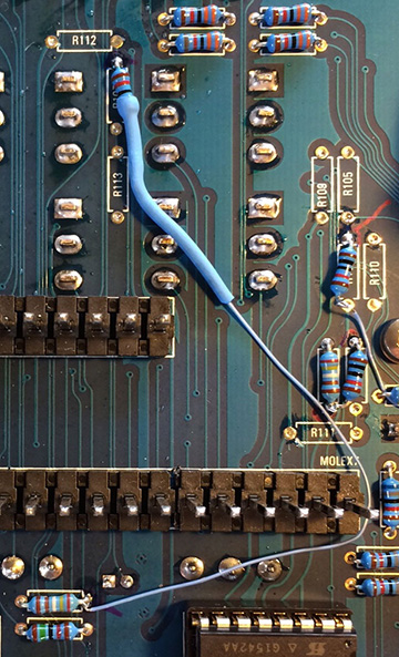 The modifications are to remove the three resistors for seven of the LEDs and add a 10K resistor between the LED cathode and the DG202 control input. Both of these signals can be found on nearby resistor pads. The Program LED modification is simply removing two resistors and changing the value of the third. All modifications are made on the motherboard.