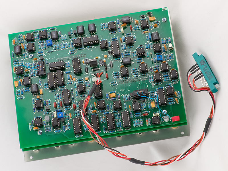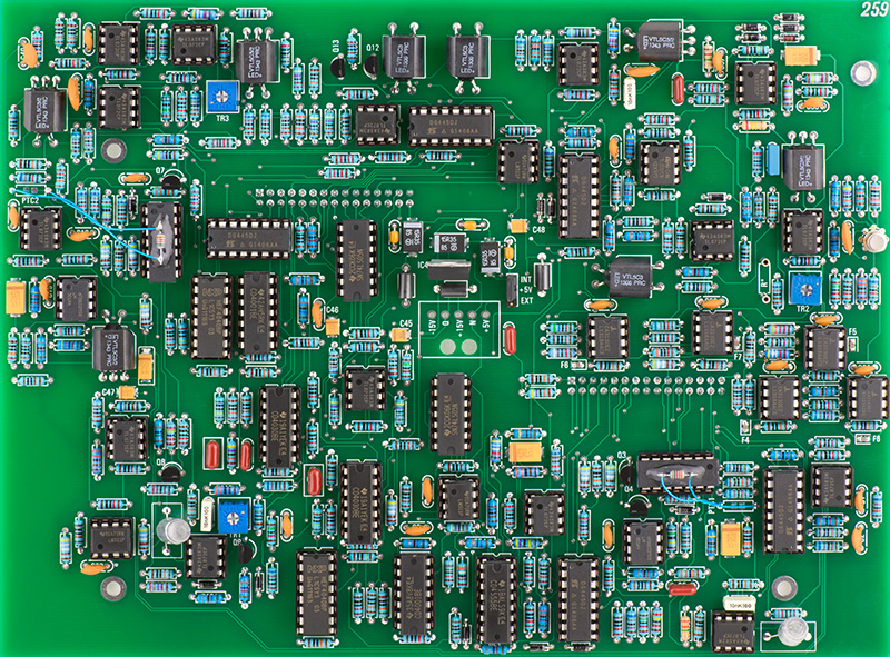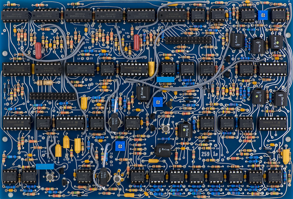 Build time for PCB2 was 7.5 hours. The resistors take a long time to install since there are so many of them and they are spread all over the PCB. I use Kester .020" diameter #24-6337-6401 331 water soluble core solder so take time every hour to wash the PCB. The trimmers, vactrols, polystyrene capacitors, and power cable are added after washing. I epoxied the vactrols onto their respective transistor array and used SIP socket posts for R*.