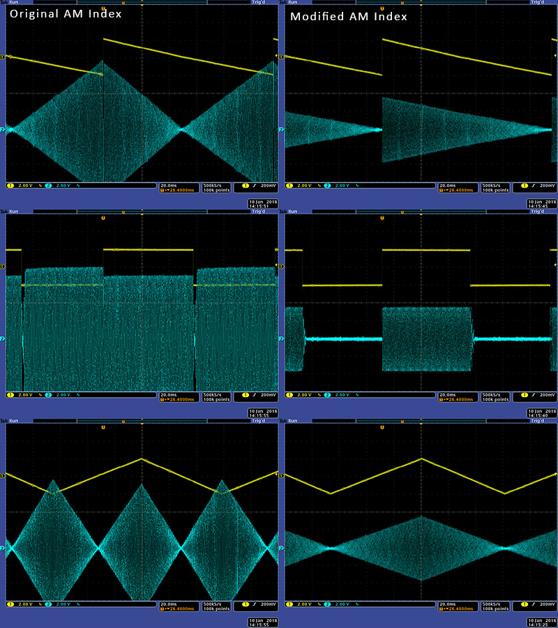 The AM Index way over modulates the signal. The "dry" signal is subtracted from a 100% AM modulated "wet" signal to generate the AM modulation. A vactrol-based VCO controls the amount of "wet" signal. The variation in vactrol performance will basically ensure that it is never correct. On many, 100% modulation occurs as early as a quarter turn. After this, the "wet" signal simply increases in amplitude thus generating a large distorted signal. I have adjusted R229 (R290A vintage version), sometimes with two series resistors, to dial in 100% AM modulation at full CW rotation. Values I have used are 1K, 910R+62R, 2K4+330R. This composite scope image shows the Final output with original resistor values on the left and modified on the right. These scope images show how over modulated the final output is where the ramp actually creates a triangle-shaped modulation and the triangle doubles the MO modulation.