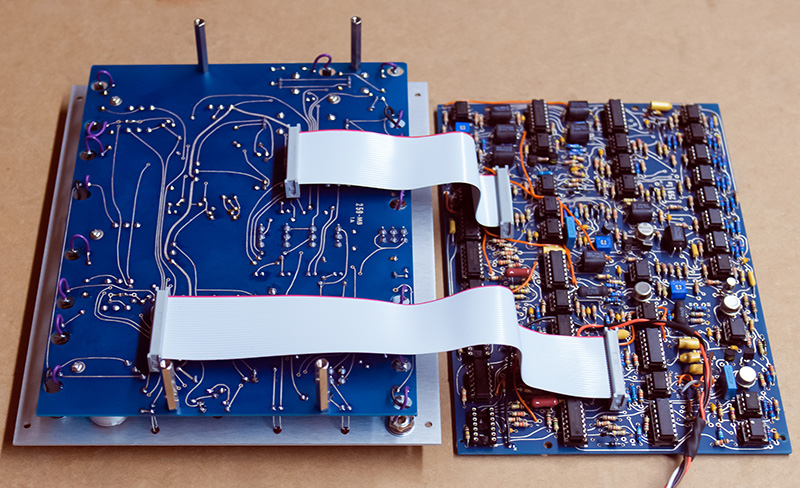 This photo shows the interconnect cables which allow the PCBs to lay flat for debug.