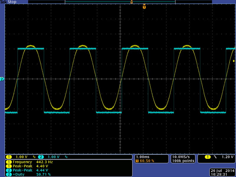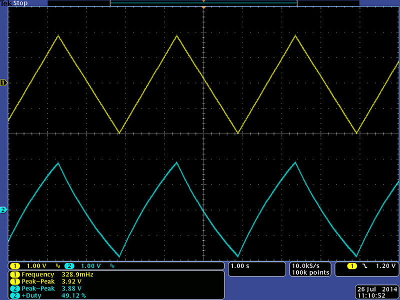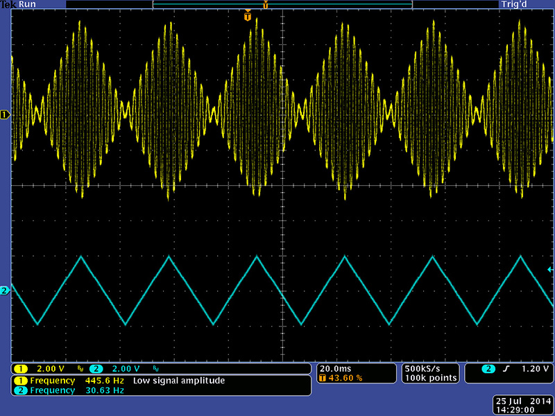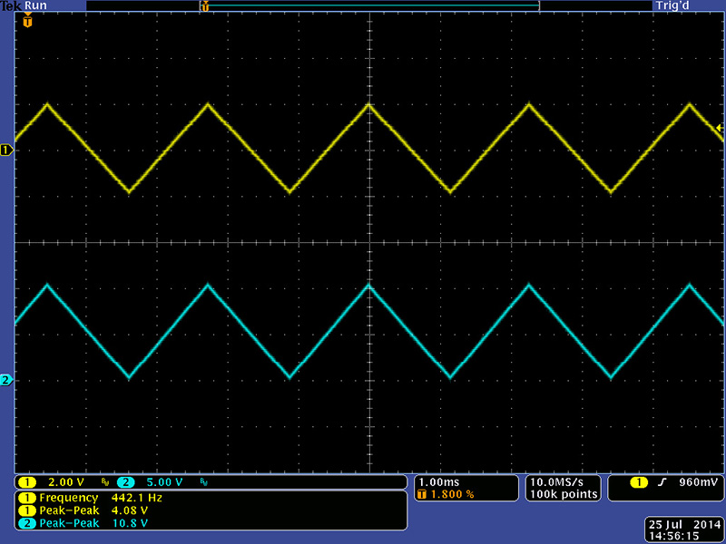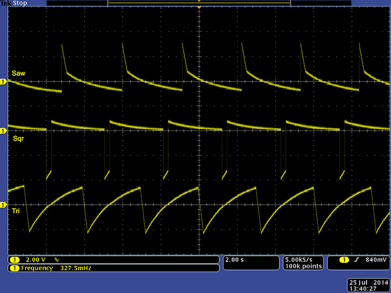 In low range the waveforms are a bit more distorted but generally pretty good. This image is a composite of three scope images showing all three waveforms at the frequency control mid setting.