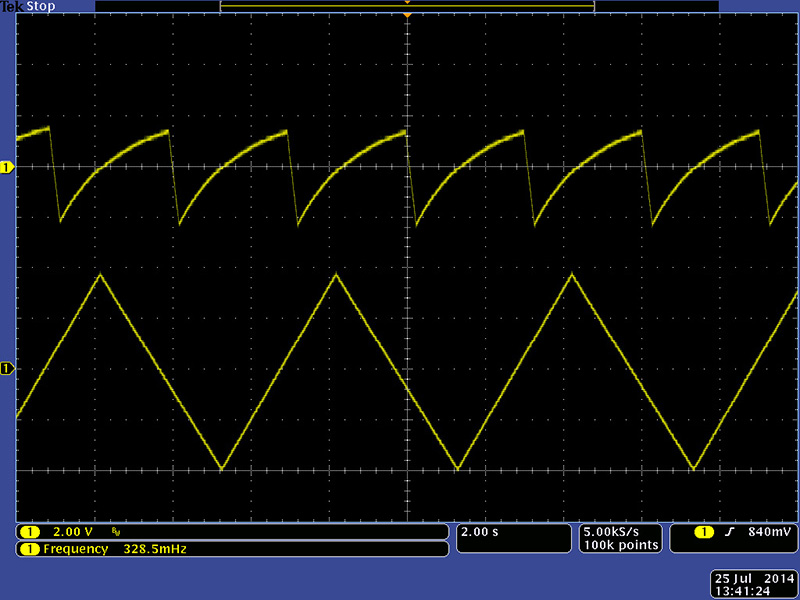 The modulation oscillator waveform distortion on the low range was quite significant. IC4C switches in a different bias point for the expo converter on low. I made some modifications to improve the match of the charge and discharge current sources but they negatively affected the waveforms on the high range. I decided instead to use IC4C to switch in a higher value integration capacitor which works very well. This image is a composite photo of the modulation oscillator lowest frequency before and after triangle wave (scope horizontal and vertical settings are different between the two and the top waveform is AC coupled). The resulting symmetry is very good..