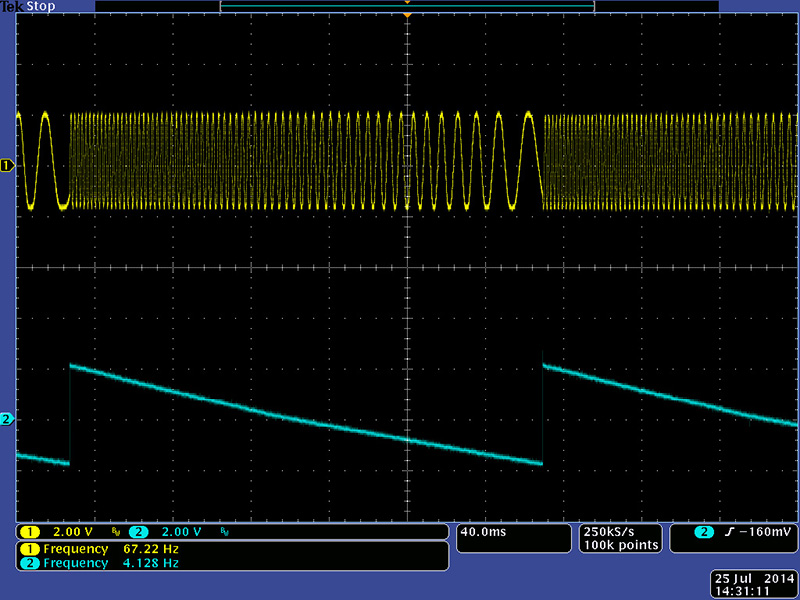 Here are three scope images of the modulation oscillator output and the signal output at the lowest frequency of 1/3 Hz. The signal signal output is capacitively coupled so there is droop in the waveforms. However, all are much improved with a near perfect duty cycle.