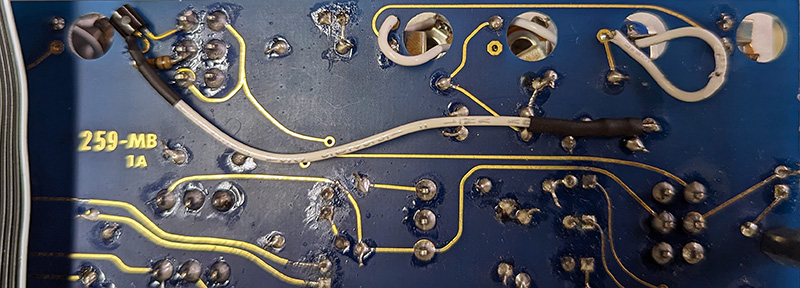 When in Both, I force IC7 pin 14 to 0V which changes the selection from the saw to a ramp, and the square to a triangle (a more elaborate modification could have changed just the saw). I simply wired a 2N3904 transistor with the emitter to the local-both-remote switch, the base through a 10K resistor to the local-both-remote switch, and the collector through a 220K resistor over to one of the switching diodes. This photo shows the modification I made on a customer's 259 repair. Sorry about the poor cell phone quality.