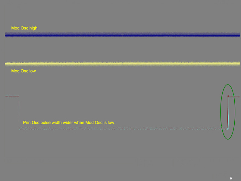 The forums mention a "bleed" of the modulation oscillator in the principle oscillator with all the modulation switches off. This module had a slight "bleed" that I could hear it as a timbre change in the square wave output. I could not hear it in the sine wave or final output. I investigated the principle oscillator circuit and found that the square output would vary in width depending on whether the modulation oscillator output was high or low. I took a scope image of the principle oscillator output with the modulation output high and inverted and added it to an image with the modulation oscillator low so similar colors become gray and unique colors stand out. You can see the difference in width circled in green and is about a 100 µS delta.
