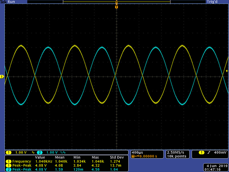 This scope image shows the input, reverb drive, output, and monitor outputs with a sine wave input and the control on CW, so a full wet signal. The lack of harmonics in the sine wave shows the reverb with a more sine wave shape.