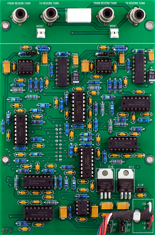The reverb recovery amplifier has high gain. I added some square pins to change be able to select the gain to unity. This allows an external effects unit to be used with this module. The reverb drive is from the LM380, and is a low impedance output with near unity gain, so sufficient to drive an external effects unit, albeit at high amplitude. Selecting the reverb recovery amplifier to unity gain allows the wet signal from the external effects unit to operate with the module. You can see these square pins and the lifted paralleled resistors just below the horizontal white line.
