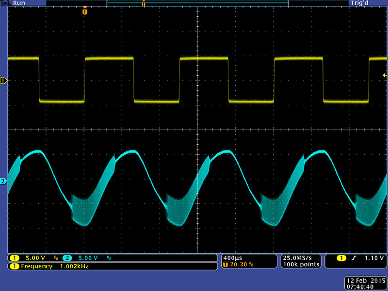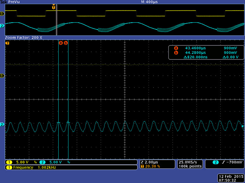 A quick cursor check shows an 820 nS period or a 1.22 MHz oscillation