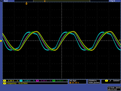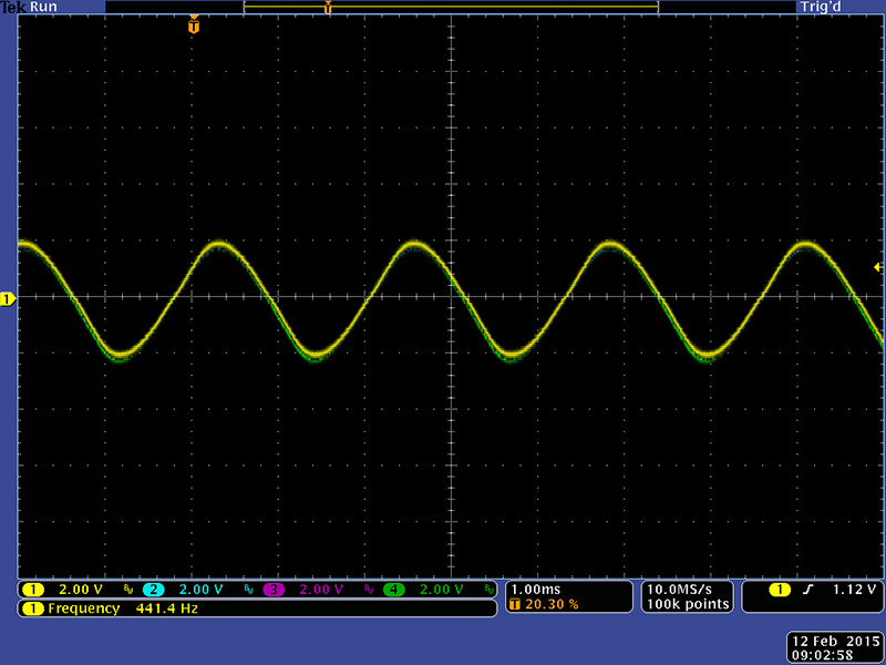A check of the different control settings and input frequency showed good section to section matching from 20 Hz (left) up to 8 KHz (right).