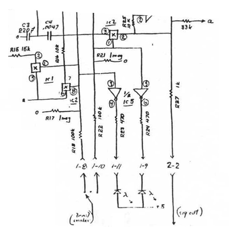 None of the non-MEMS clones implement this portion of the schematic. The switches in those simply turns the LED on. However, this portion of the schematic does not function correctly. When the mode switch is set to combo, the input to the CMOS switches and 74LS05 are pulled down by R17 and R21 to a logic 0. That disables both LEDs, at least that is what the thought was. A 74LC05 has 400 uA of current and this scheme ends up with the input to the 74LS05 at about 1.6V or so which is realized as a logic 1 so the LEDs are always on. The maximum resistance for pulling down an LSTTL input is 2K without any noise margin, or 1K with 400 mV of noise margin. These resistors are 1M and 100K. It's as if Don designed this for a CD4069 CMOS gate. Tthe 74LS05 on the side for IC 5,6 looks like it was written over something that was erased. A CD4069 doesn't have the current sink capability to drive the LEDs. It can sink guaranteed a maximum of 0.500 mA which would require a 6K8 resistor, not a 470R. It's as if Don used a CMOS part which couldn't drive the LEDs so replaced it with a LSTTL part and didn't do the required modifications on the schematic.