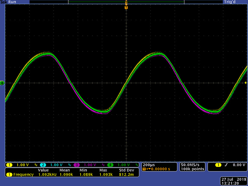 I saw no oscillations on V3 which could indicate the new layout has improved that issue. I matched the vactrols which resulted in very good channel to channel matching eliminating the gain issues I saw on the previous version where I didn't match vactrols. I adjust one channel to maximize bandwidth and then adjust the other channels to match. This scope image shows the matching between channels.