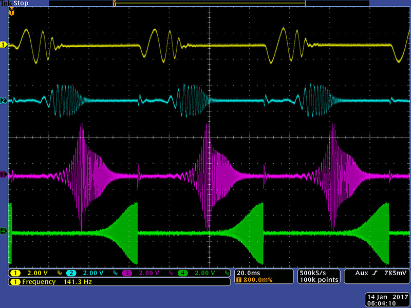 This scope image shows the four channel outputs driven by a swept sine oscillator. The <250 Hz channel and the 250 Hz -1 KHz channels are well behaved. The 1 KHz - 4 KHz channel has a peak and the output amplitude is considerably higher and the >4 KHz channel output is likewise high amplitude.