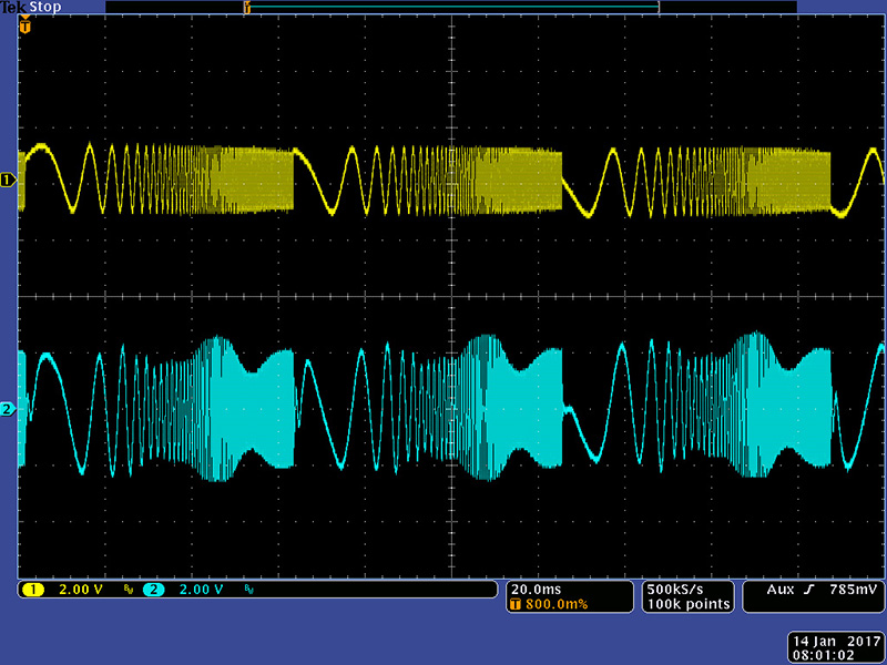This scope image shows the Sum Output of the modified filter. The yellow trace is my swept sine input and the cyan trace is the Sum Out which is reasonably flat.