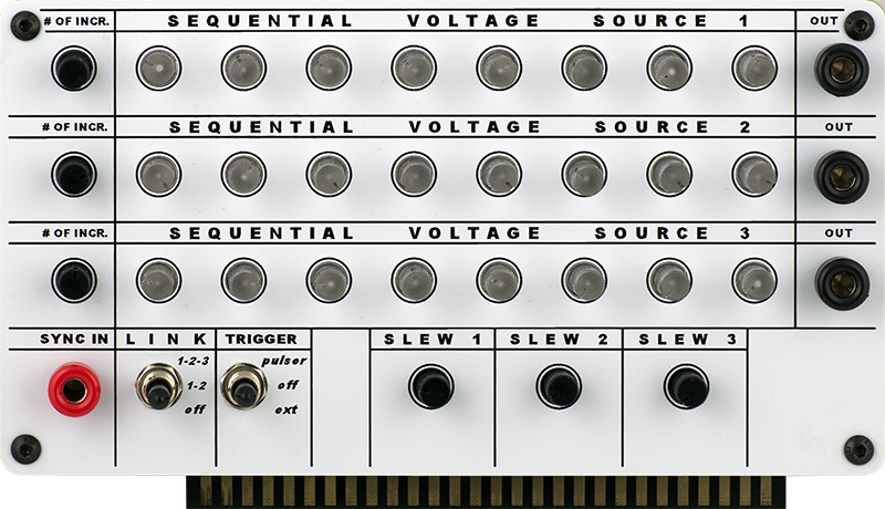 I have a 208 Triple Sequencer card as described on the Triple Sequential Voltage Source for the Buchla 208 thread on the ModWiggler forum. This card is almost all SMT, and as Ron describes, is really a challenging build. It is loosely inspired by the 123 Sequential Voltage Source and adds a lot of capability to the 208. The leftmost control for each sequencer sets the number of stages for that sequencer and there is an additional slew control for the output.