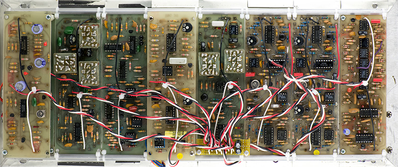 The keyboard consists of the keyboard and QUAN module. One of the LEDs was dead which required removing the touch PCB to access the rear-soldered LED. The keyboard was also built with sockets that fractured and lost tension with the IC pins. Replacing the sockets restored operation.
