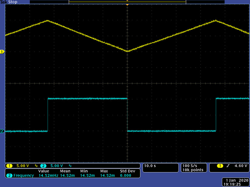 The LFO and S&H are two separate functions. The LFO triangle and square output are unipolar 0 to 10 volts. The minimum LFO frequency is 14.5 mHz, or one cycle every ~69 seconds.